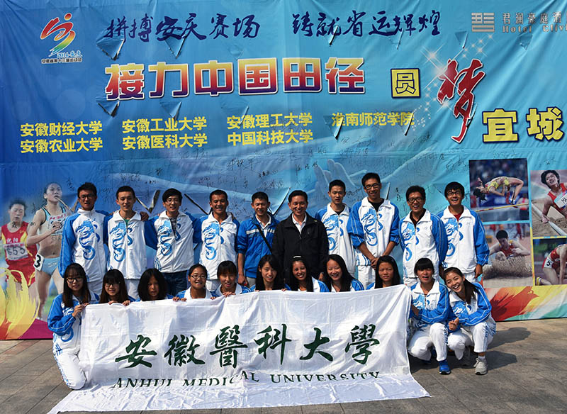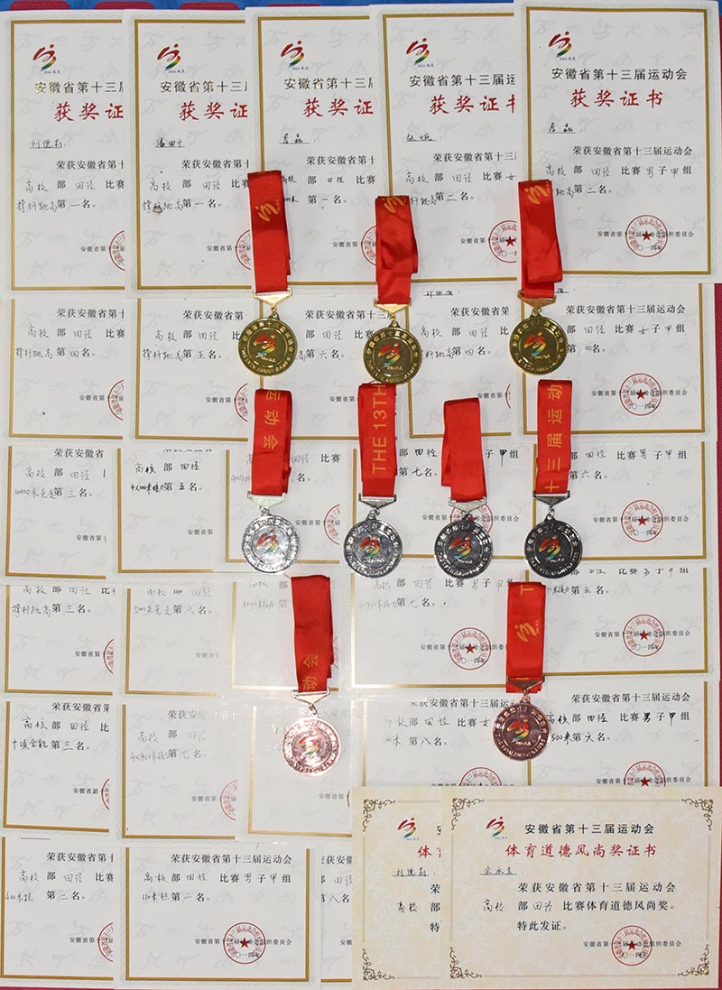 在日前刚刚结束的2014年安徽省第十三届运动会高校部田径比赛,我校田径代表队在余千春、王道明等教练员的带领下,比赛中不畏强手,顽强拼搏,夺得了男子甲组团体总分冠军,男女团体总分第三名,并有11人次打破省纪录,获得男子100M、男子撑竿跳高、女子撑竿跳高等多个单项冠军,这是我校田径运动成绩的一次突破,也是我校田径史上最辉煌的成绩。田径项目已成为我校的传统优势项目,在此次省运会上共获213分,特别是我校女子撑竿跳高包揽前6名并且6人全部打破省纪录,创造了省运会上的一个奇迹,同时也充分展现了安医大人的风采。