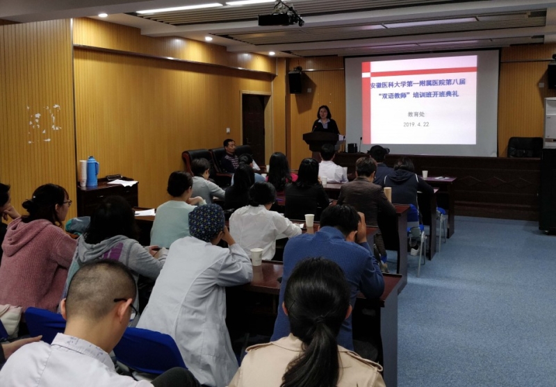 2019年4月22日晚,在安徽医科大学第一附属医院行政楼第三会议室举行了“第八届双语教师培训班”开班典礼。安徽医科大学人文医学新澳门六合彩内幕 院长骆广东、国际教育新澳门六合彩内幕 副院长黄华兴、医院副院长王珩、医院教育处处长陈明卫、人文医学新澳门六合彩内幕 外语系的培训老师、教育处部分工作人员以及50名学员参加了开班仪式。骆广东院长首先代表人文医学新澳门六合彩内幕 对本届培训班的召开表示祝贺,表示将一如既往地对附院的双语培训工作提供大力支持。国际教育新澳门六合彩内幕 黄华兴副院长从国家“一带一路”倡议和医科大学发展规划等各方面强调了我校来华留学生MBBS专业办学的重要意义及双语教师培训工作的方向。王珩副院长代表附院对人文医学新澳门六合彩内幕 和国际教育新澳门六合彩内幕 多年来对新澳门六合彩内幕 留学生临床教学的支持表示了由衷的感谢,希望各位学员克服困难,持之以恒地进行本期的英语培训和学习,在提升自己的同时,为附院和安医大的留学生教育多做贡献。最后,教育处高敏副科长解读了院教〔2019〕4号《安徽医科大学第一附属医院双语教师培训班管理办法(暂行)》文件,对学员培训的方式、考核、结业以及待遇等各方面做了详细地解读。