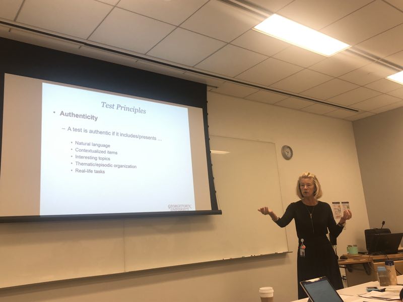 最后一节课上,每个学员都必须就本次研修项目中自身确定的目标及目标的实现,以及在研修过程中学习到的教学方法在今后教学实践中的应用做一个最后的汇报。每一位学员都认真的准备,在最后的结业陈述中表达了自己的学习心得。乔治城大学语言中心的苏珊主任为颁发了结业证书,为本期研修画上了圆满的句号。