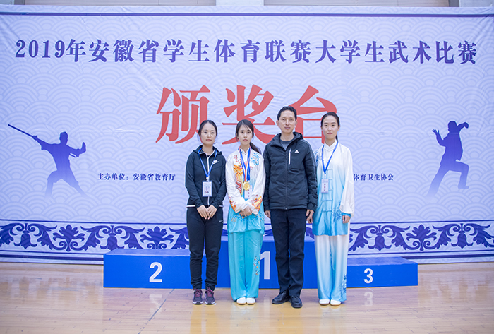 12月6日至8日,2019年安徽省大学生武术比赛在阜阳举行,全省共有51所高校446人参加比赛。我校余千春教练带领我校滕玉竹、刘晓丹、崔研三位同学组成的代表队,夺得了女子太极剑冠军。