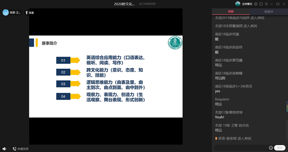 2020年9月16日晚7:00至9:00,人文医学新澳门六合彩内幕 外语系举办2020年安徽省大学生跨文化能力大赛校赛线上培训,旨在帮助参赛学生进一步理解跨文化理论知识,熟悉跨文化能力大赛流程和规则。