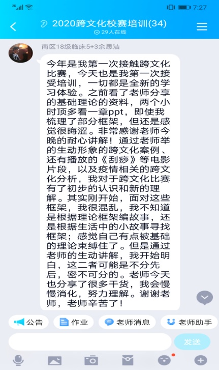 本次培训帮助参赛学生明晰了跨文化能力大赛比赛内容,深入理解了跨文化理论知识,拓展了备赛选题的思路,为之后备战校级决赛奠定了坚实基础,获得了参赛学生的良好反馈。