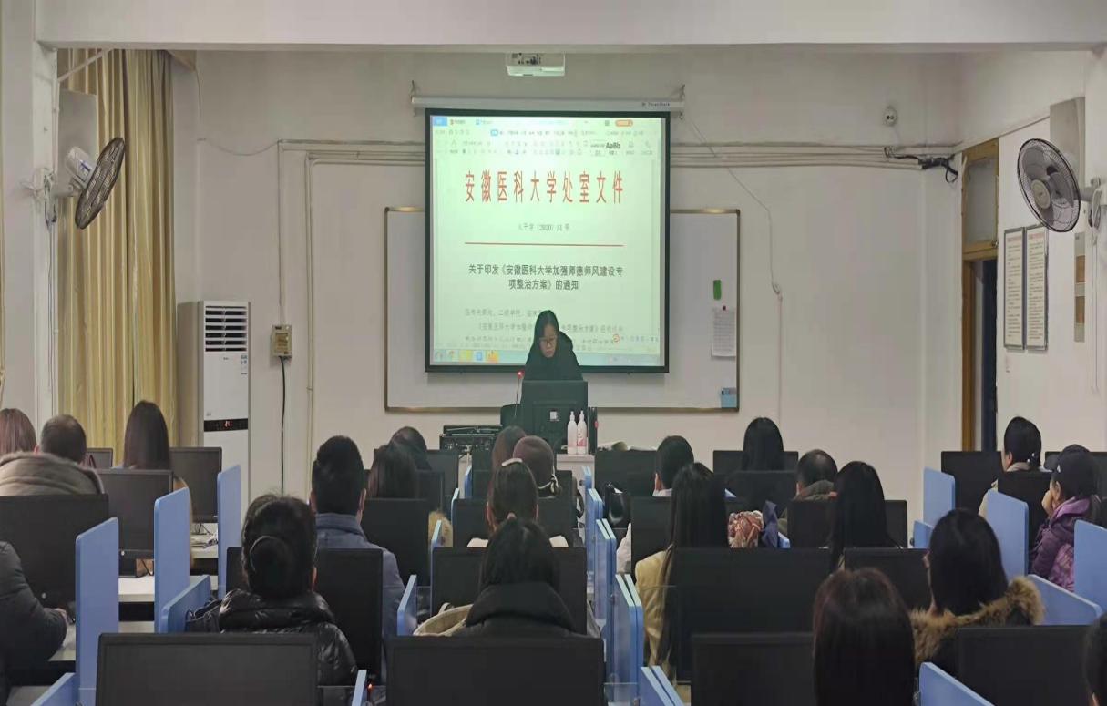 2020年12月9日下午,外语系召集全体教职员工在第五语音室召开加强师德师风建设专项整治工作会议,主要学习了安徽医科大学《安徽医科大学加强师德师风建设专项整治方案》、习近平总书记对教师队伍建设特别是关于师德师风的重要论述、《关于加强和改进新时代师德师风建设的意见》、《关于全面深化新时代教师队伍建设改革的意见》、《教育部关于进一步规范高校科研行为的意见》、《关于建立健全高校师德建设长效机制的意见》和《高等学校预防和处理学术不端行为办法》精神。之后,要求所有教职员工重点按照潜心教书育人、坚持言行雅正、遵守学术规范等方面进行深刻剖析,并填写了《个人“师德师风问题”自查自纠表》(附件二),组织全体教师和教辅人员签署《“师德师风”承诺书》(附件三),同时提交电子档和纸质版备案。