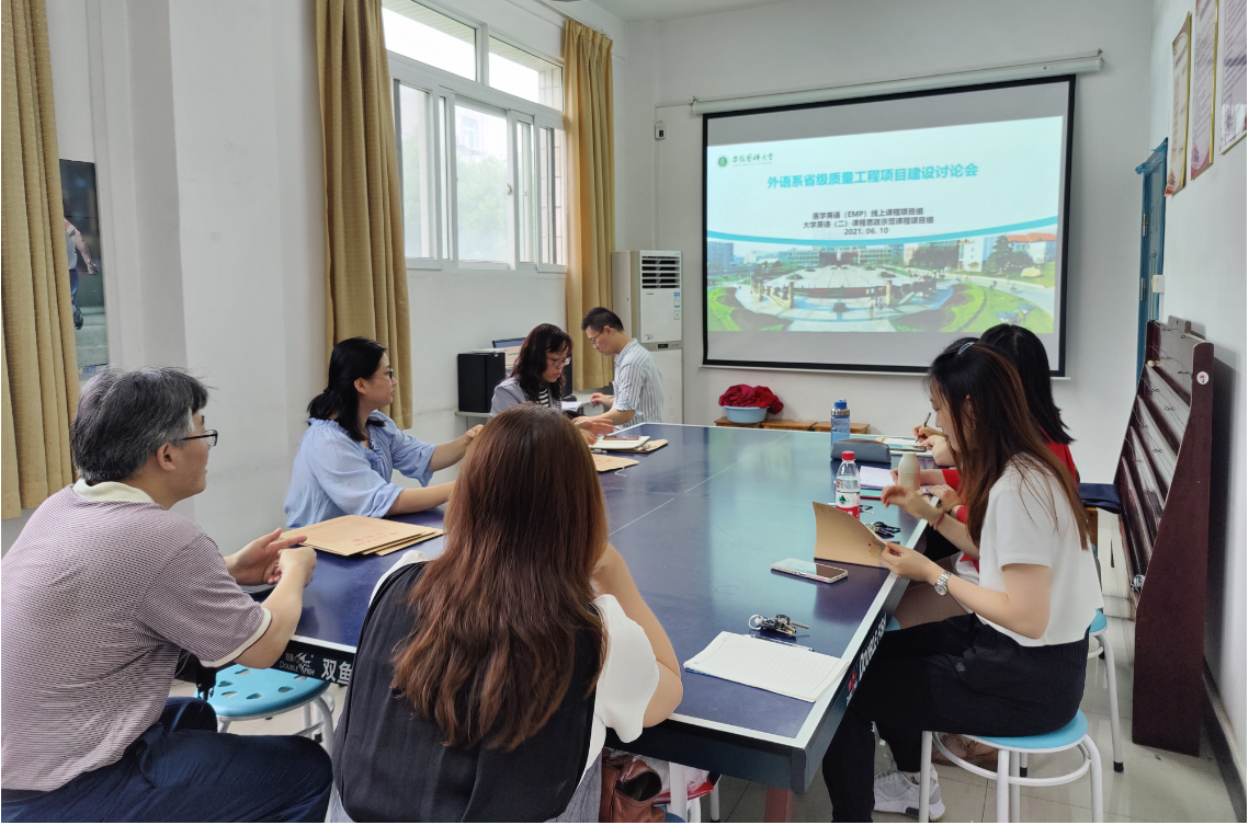 2021年6月10日上午,外语系在人文医学新澳门六合彩内幕 三楼活动室组织2020年度省级质量工程立项项目建设讨论会。医学英语(EMP)线上课程项目组和大学英语(二)课程思政示范课程项目组成员参加会议讨论。