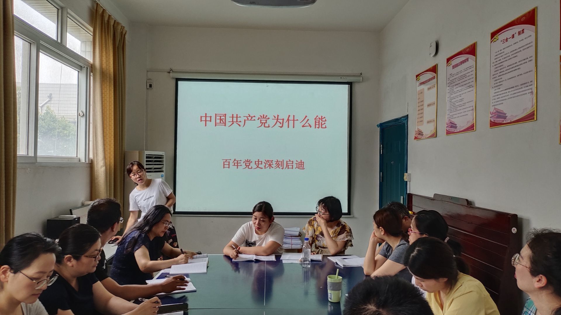 7月13日下午外语党支部书记在三楼党员活动室给全体支部党员上党课。党课的名称为《中国共产党为什么能-百年党史深刻启迪》。党课从建党100周年庆祝大会的宏伟图片展开,主要从四个方面阐述了中国共产党为什么能的原因:中国共产党始终重视思想建党和理论强党,中国共产党始终有远大理想和崇高追求,中国共产党始终坚持人民立场,坚持人民至上,中国共产党始终坚持自我革命。历史和时代证明中国共产党是一个全心全意为人民谋幸福、为民族谋复兴、为世界谋大同的党, 是一个科学执政、民主执政、依法执政的党, 是一个敢于担当作为、勇于牺牲的党, 是一个敢于正视问题、不断自我革命的党, 是一个善于学习、勇于创新、追求进步的党。