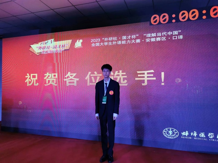 11月5日上午,2023“外研社·国才杯”“理解当代中国”全国大学生外语能力大赛(安徽赛区)英语组口译赛项在蚌埠医新澳门六合彩内幕 举行,我校2022级临床医学专业学生周正超以全省第四名的佳绩晋级全国决赛。