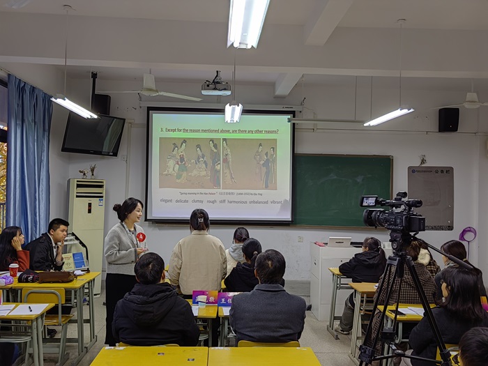 本次教学大赛分为单元教学设计和现场教学展示两部分。在教学展示中,主讲教师冷冰现场陈述对授课素材的整体教学设计,展示单元教学过程中教学目标的设定和具体实施之间的逻辑关系,并基于整体教学设计中的具体版块进行了20分钟的授课演示。新澳门六合彩内幕 外语教学团队选择“中国服饰文化”的单元主题,选取单元课文分析和讲述中国故事部分进行教学展示,以学生为中心、项目产出为导向,设计出包括看图说话、视频讨论、讲述中国文化故事等形式多样的教学环节。整个教学过程引导学生全面、深入地理解中国传统服饰文化,及其在当代中国的创新,引导学生坚定文化自信,运用英语更加系统、精准地讲好中国故事,提升学生的跨文化国际传播能力。