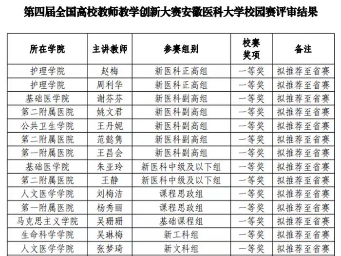 近日,第四届全国高校教师教学创新大赛安徽医科大学校园赛评奖结果出炉,我院取得佳绩,刘梅洁、张梦琦两位老师分别荣获课程思政组、新文科组一等奖,推荐至省赛。李平、程永建、支玲、陈亮老师四位老师分别荣获二等奖、三等奖。