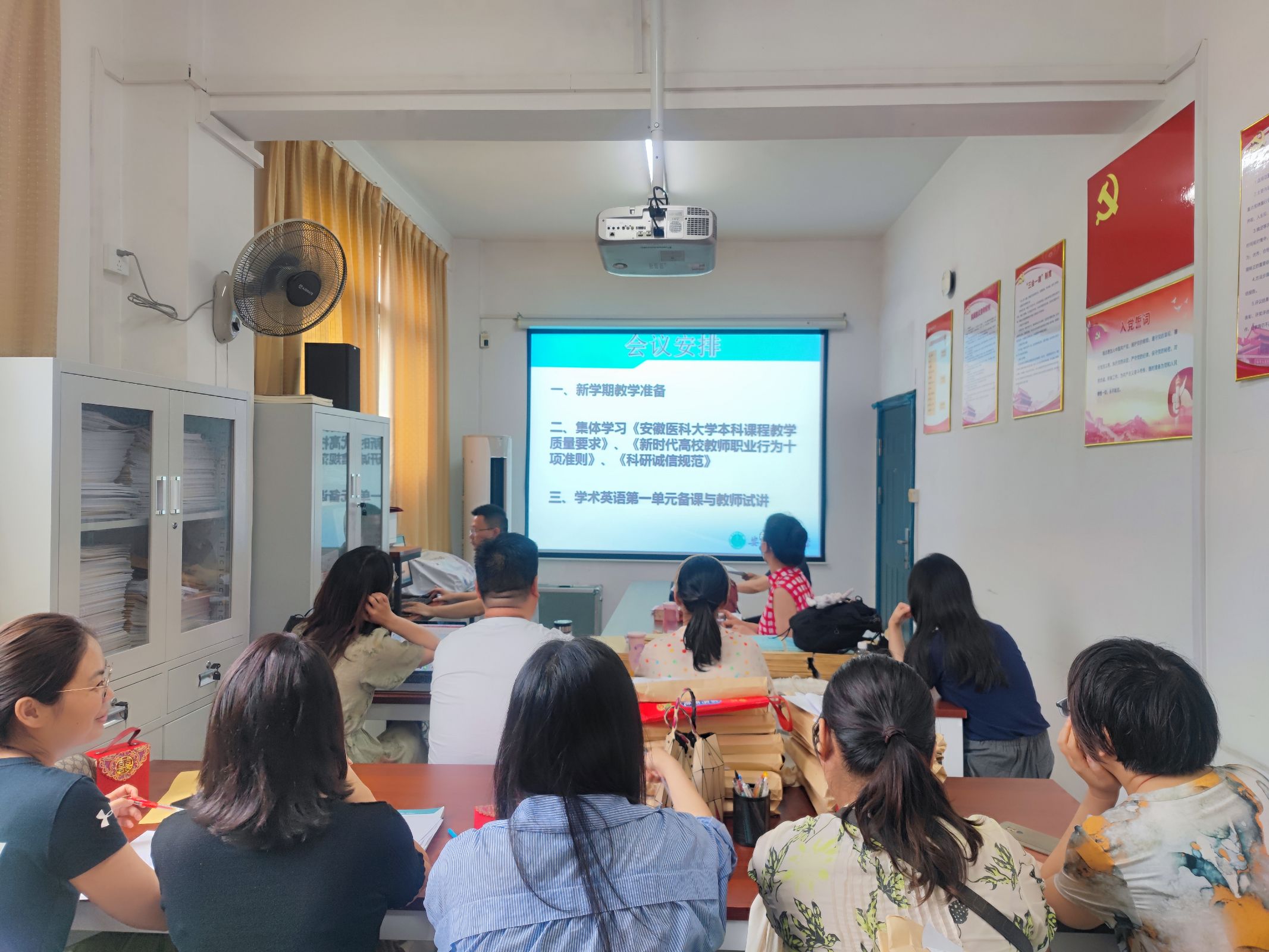 教研组还开展了师德师风、科研诚信、本科教育教学审核评估的专题教育活动,全体教师集体学习了《新时代高校教师职业行为十项准则》、《科研诚信规范》、《安徽医科大学学术不端行为处理办法》、《安徽医科大学本科课程教学质量要求》、《安徽医科大学教学事故认定与处理办法》等相关文件。此外,教研组全体教师结合第一周上课情况,围绕课程学时调整后的课程内容安排和教学设计思路进行了典型案例分享和广泛交流讨论。