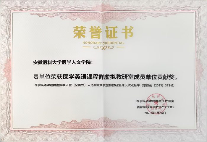近年来,新澳门六合彩内幕 外语系不断创新“外语+医学”教学模式,获批省级一流线上课程、省级课程思政示范课程、省级“四新”研究与改革实践项目及省级规划教材等。在本次会议上,新澳门六合彩内幕 荣获全国医学英语课程群虚拟教研室成员单位贡献奖。外语系将以虚拟教研室的合作建设为契机,继续推进医学英语课程教学改革,提高医学生的国际交流能力和医学人文素养,助力我校高质量学术型医药卫生人才培养。(外语系 王然)